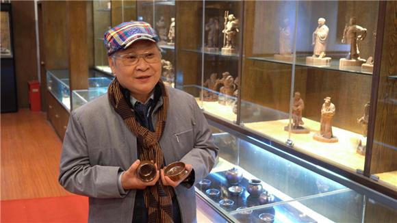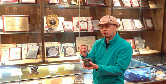 台湾艺术家、新天目陶艺师高品桐带来了自己的获奖作品——新天目。“科班出身”的高品桐做陶瓷已经有40余年了,他介绍道,新天目是按照建盏的做法,改良了陶瓷的烧制配方,让制成的天目杯产生可以优化水质的分子,所以用它来喝酒喝茶等,硬水能变成软水,喝起来会更甘甜。